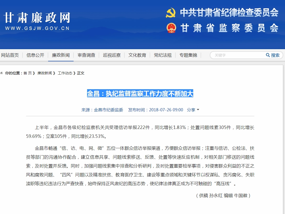 《甘肃廉政网》金昌:执纪监督监察工作力度不断加大